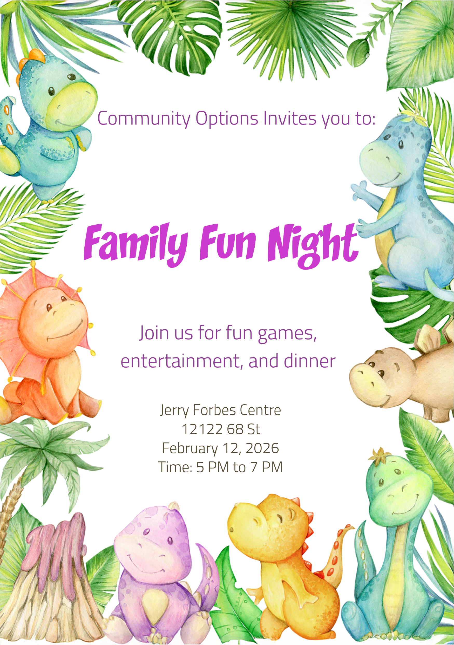 The best memories are made when families come together.Get ready for an evening of fun, laughter, and community connection! Bring the whole family and join us for games, activities, and special moments together. CostFree AttireCasual DATE & TIMETuesday, February 12, 2026 LOCATIONJerry Forbes Center for Community Spirit |